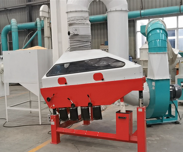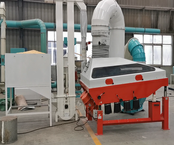 谷物精选:同样利用谷物进入 TDV-200重力分选机,由于负压的作用使混合物料处于悬浮和半悬浮状态,物料流动中与机体内部的鱼鳞板相互作用。由于物料比重不同,摩擦系数差导致物料不同的方向流动,然后根据物料情况调整出料口,精选出谷物和石头、轻杂等。